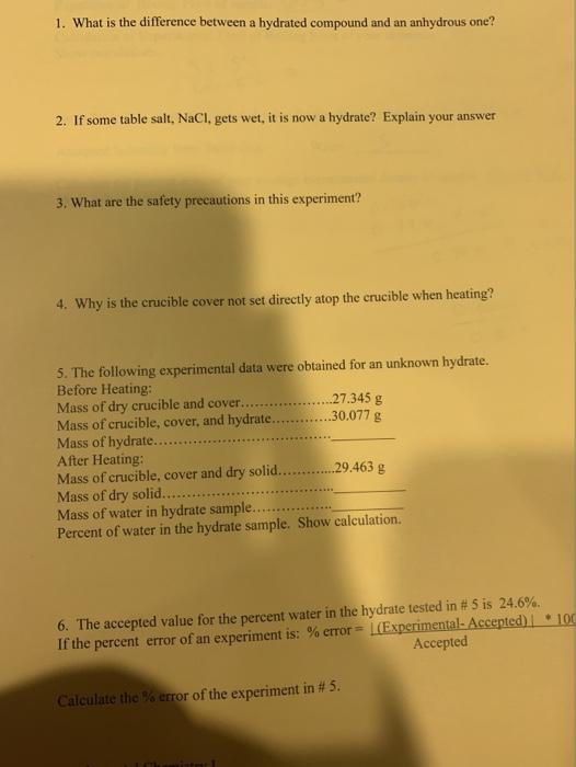 Solved 1 What Is The Difference Between A Hydrated Compound Chegg Com