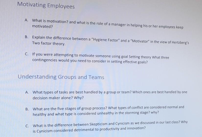 Solved Motivating Employees A What Is Motivation And What Chegg Com